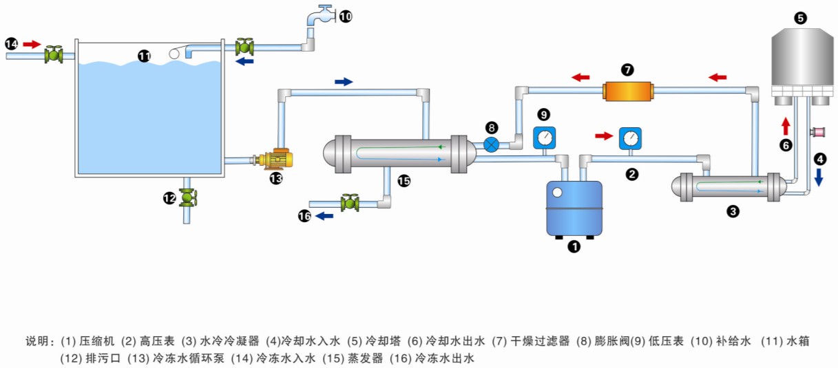 一體化水冷式箱型工業(yè)冷水機(jī)組原理圖: